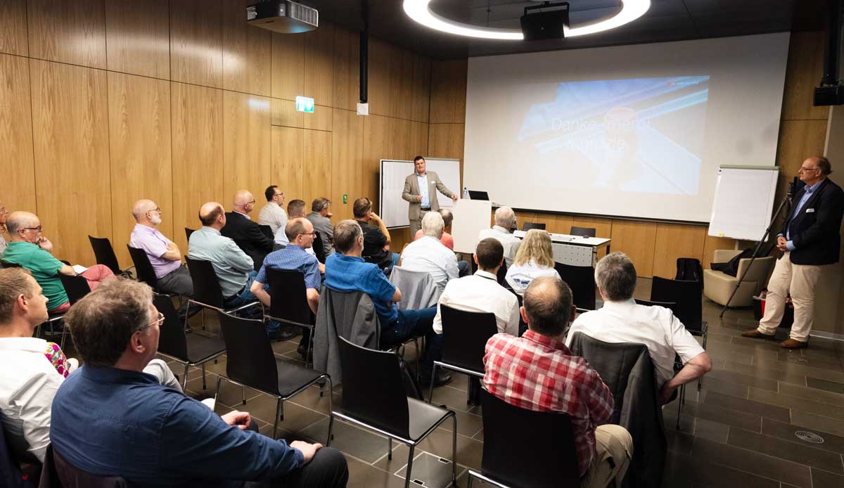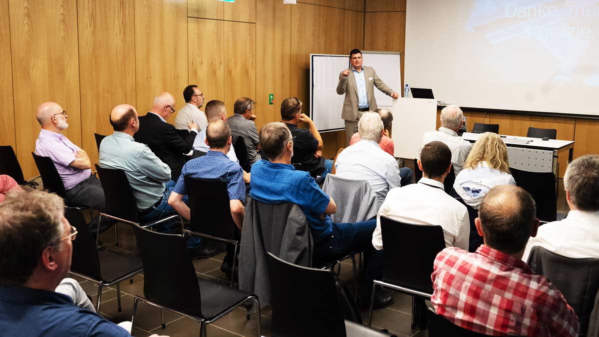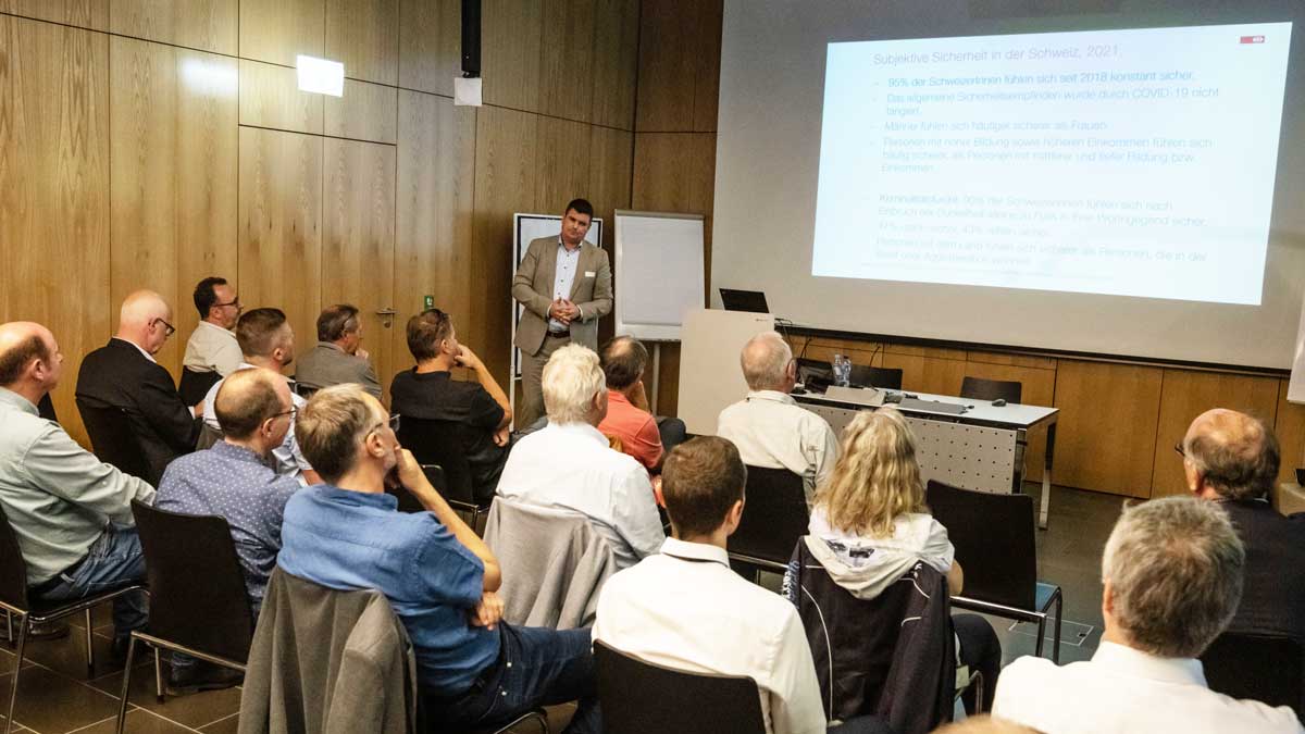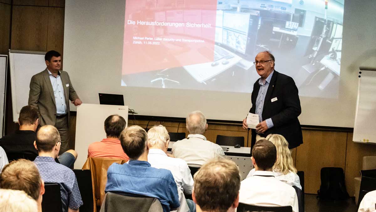 Im Anschluss an die Delegiertenversammlung vom 11. Mai 2022 konnten sich die Gäste ein Bild der aktuellen Sicherheitslage im öffentlichen Verkehr machen. Michael Perler, Leiter Security und TPO der SBB referiert gleichermassen spannend und lehrreich zum Thema «Herausforderung Sicherheit» .