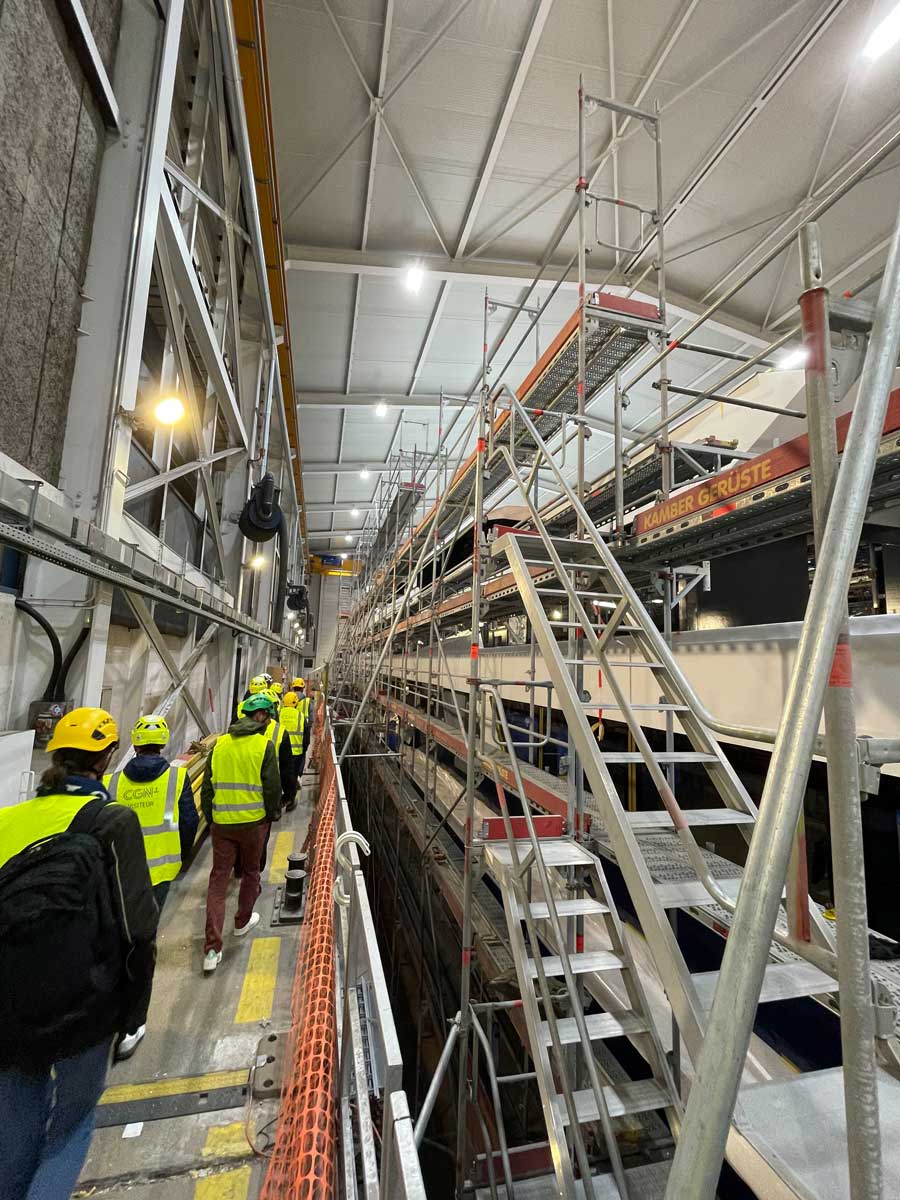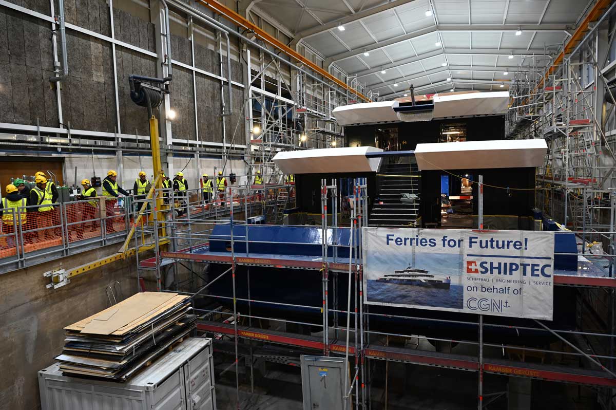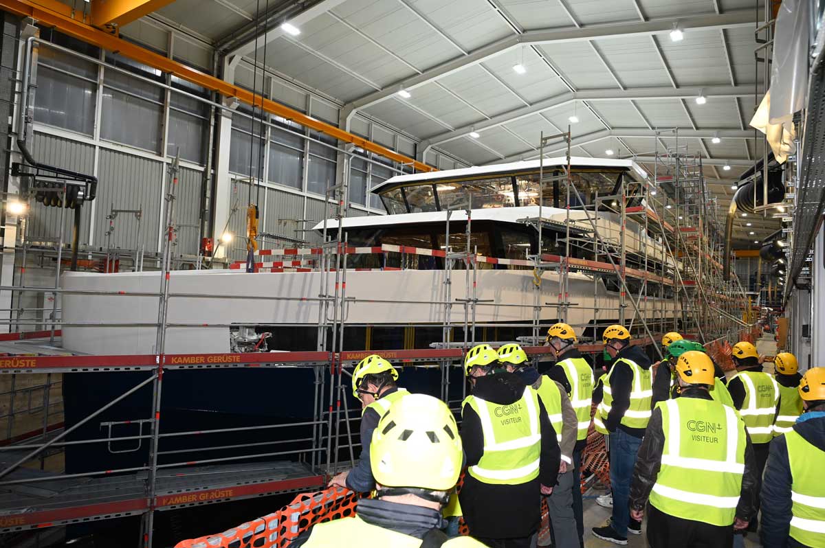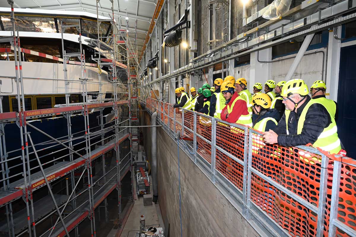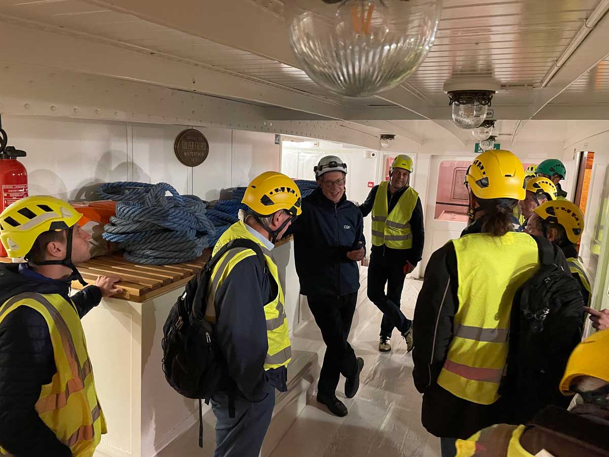 Unter der Leitung der Herren Imhof und von Flüe konnten sich die Teilnehmer ein Bild von der Herstellung der NaviExpress-Schiffe machen. Angesprochen wurden auch die Herausforderungen und nötigen Lösungen, um mehr als 2,5 Millionen Passagiere pro Jahr (Zahl für 2022) auf dem Seeweg zu befördern.
