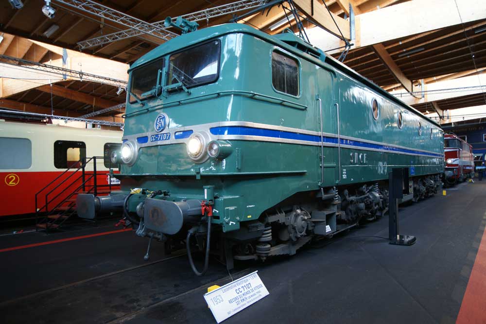 La Cité du Train réunit à Mulhouse 130 pièces roulantes (en plus d’une dizaine de milliers d’objets en lien avec les chemins de fer) et en gère, en collaboration avec le service SNCF PATRIMOINE, pas moins de 300, un grand nombre étant stationnées ailleurs en France (Nîmes, Chambéry, …). La plupart des matériels exposés ou placés en réserve, appartiennent à la SNCF et sont dans leur état d’origine ou dans une configuration très proche de celui-ci, à l’exemple de la CC 7107. De fait, la Cité du Train est en mesure de retracer, à l’attention des différents publics, les grandes périodes et évolutions du mode ferroviaire en France, des origines (1827) aux années 2000. Sa collection très complète va de l’iconique Saint-Pierre de 1844 à une motrice et à une remorque, issues de la rame TGV 325 du record du monde de 1990, sans omettre les automoteurs (dont LE Bugatti), un large éventail de voitures (CIWL, TEE, …) et de locomotives à vapeur, Diesel ou électriques ! Ce « patchwork » permet, grâce à des scénographies « son et lumière » et à une progression bien adaptée dans le circuit de la visite, d’appréhender de manière vivante et dynamique une thématique qui n’est pas forcément connue et appréciée, à sa juste valeur, par le plus grand nombre. Les attractions en extérieur permettent aussi de parfaire « l’initiation » des publics, notamment avec la possibilité d’effectuer « un baptême du rail » en draisine DU65, jusqu’à l’arrêt du tram / tram-train (à environ 500m) sur la voie d’accès de la Cité du Train.